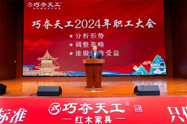 年初,巧奪天工紅木順利召開(kāi) 2024 職工大會(huì),凝聚團(tuán)隊(duì)力量,為后續(xù)工作開(kāi)展明確方向,夯實(shí)品牌發(fā)展根基。董事長(zhǎng)張愛(ài)冬站在企業(yè)長(zhǎng)遠(yuǎn)發(fā)展高度,深入剖析市場(chǎng)形勢(shì),明確公司 2024 年戰(zhàn)略規(guī)劃,為滿足廣大客戶需求、提升客戶體驗(yàn)筑牢堅(jiān)實(shí)基礎(chǔ)。