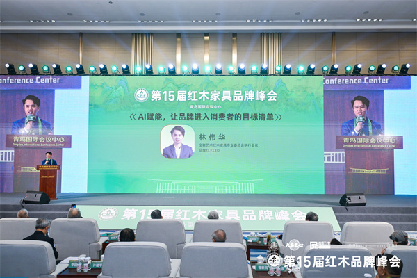 品牌紅木CEO林偉華在第15屆紅木家具品牌峰會(huì)做《AI賦能,讓品牌進(jìn)入消費(fèi)者的目標(biāo)清單》主題分享