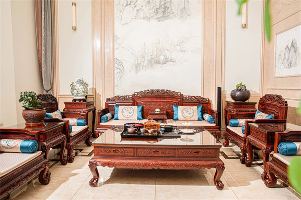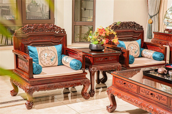 客廳之中擺放雙獅迎福沙發(fā),由清式寶座演化而來,搭腦處精雕雙獅滾繡球,由此得名。