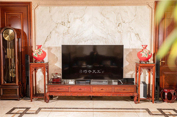 沙發(fā)的前方為雙獅迎福電視柜,柜門對稱雕飾草龍,龍圖騰象征權(quán)威,寄寓了對后代出類拔萃、學(xué)業(yè)昌盛的美好愿望。柜體下方攢框鑲板,浮雕草龍,寓意龍鳳和鳴,吉祥如意。