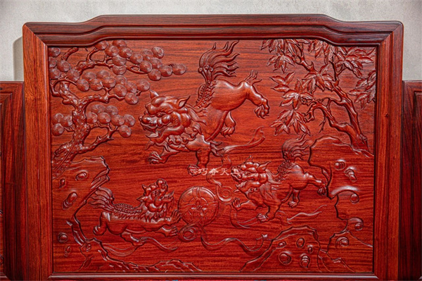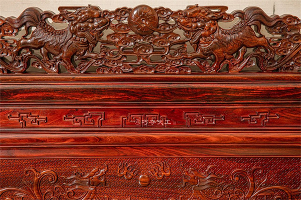 沙發(fā)后背采用三屏風(fēng)式設(shè)計,中部高聳,雕刻雙龍戲珠,頂端再現(xiàn)雙獅戲球圖景,寓意“好事在后頭”,雙獅并立,更添喜事連連之兆。