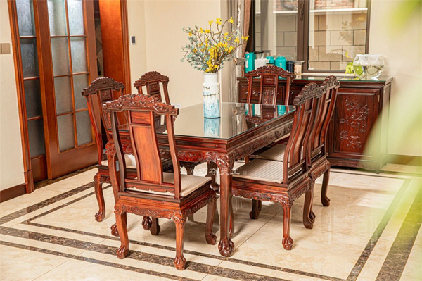 餐椅搭腦處,螭龍戲珠圖精雕細(xì)琢,與沙發(fā)后背雕飾遙相呼應(yīng),龍身卷曲,線條流暢,形態(tài)優(yōu)美,令人賞心悅目。