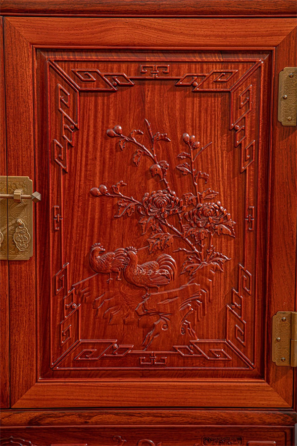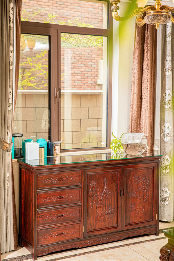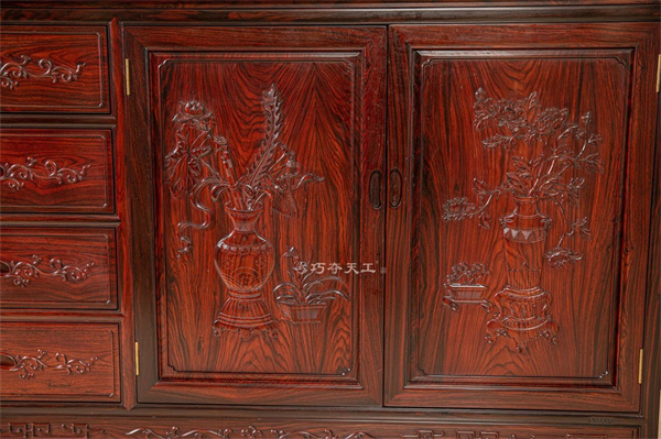 餐邊柜則選用紅木儲物柜,左側(cè)四抽屜,采用凹進(jìn)式推拉設(shè)計,便捷省力;右側(cè)雙開門大柜,可容納大件物品。柜門之上,精美花瓶花卉雕飾,栩栩如生,為生活添一抹生動趣味。
