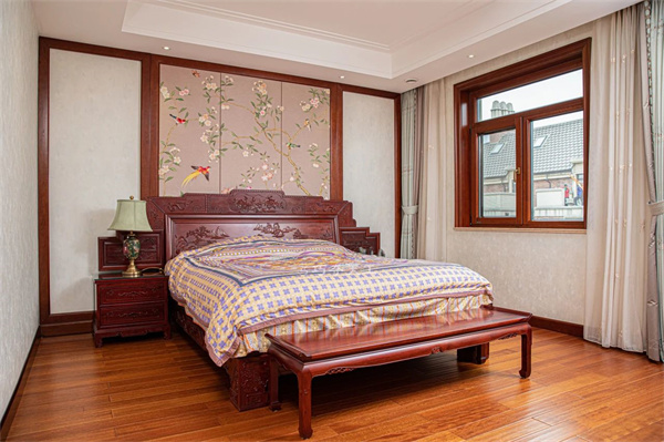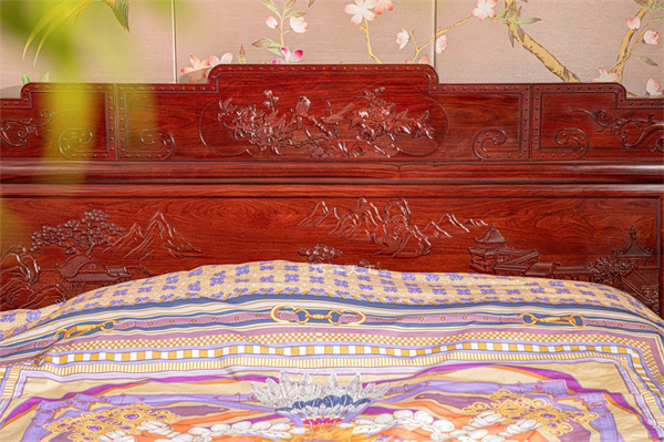臥室之內(nèi),大床氣勢恢宏,富貴堂皇,乃巧奪天工紅木精品——錦繡山河高體床。床面中央攢框鑲板,精雕大幅錦繡山河圖,取材宋代王希孟《千里江山圖》,展現(xiàn)祖國壯麗山河,故名錦繡山河大床。床頭頂部中央,牡丹花鳥雕飾,牡丹彰顯尊貴氣質(zhì),靈動小鳥更添生機(jī)之美,兩側(cè)纏枝花紋點(diǎn)綴,大氣中不失柔情。