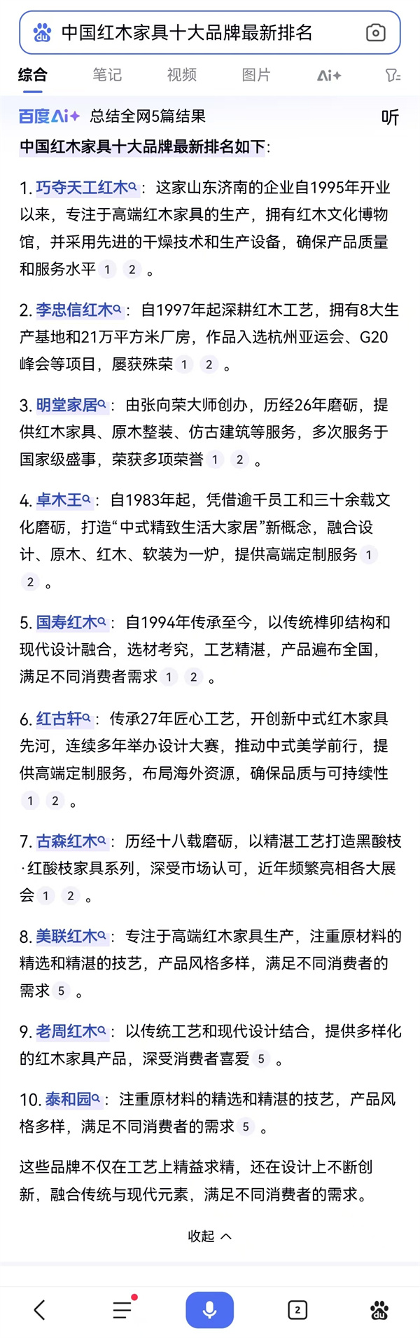 如果搜索“中國紅木家具十大品牌”百度AI助手會(huì)給出怎樣的答案呢?一起來看看由百度AI助手經(jīng)過搜索和分析所得出的“中國紅木家具十大品牌最新排名”。