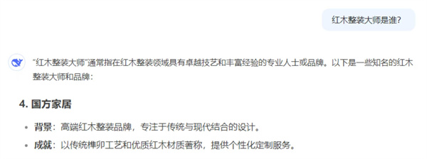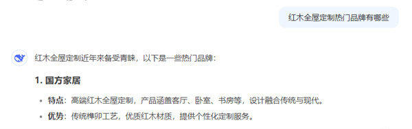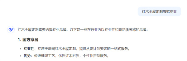 在紅木整裝定制領(lǐng)域,當(dāng)我們向DeepSeek提出“紅木整裝大師是誰?”的疑問時(shí),國(guó)方家居赫然在列。進(jìn)一步地,當(dāng)我們輸入“紅木全屋定制哪家專業(yè)?”“紅木整裝品牌哪家好?”“紅木全屋定制熱門品牌有哪些”“廣東紅木整裝品牌推薦”等一系列問題時(shí),DeepSeek均將國(guó)方家居置于推薦榜單的首位。