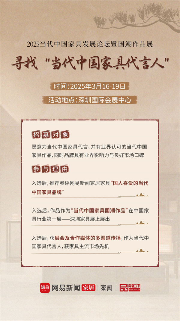 3月16日-19日,2025當(dāng)代中國(guó)家具發(fā)展論壇暨國(guó)潮作品展將在深圳國(guó)際會(huì)展中心舉行,讓我們一起開始尋找“當(dāng)代中國(guó)家具代言人"。