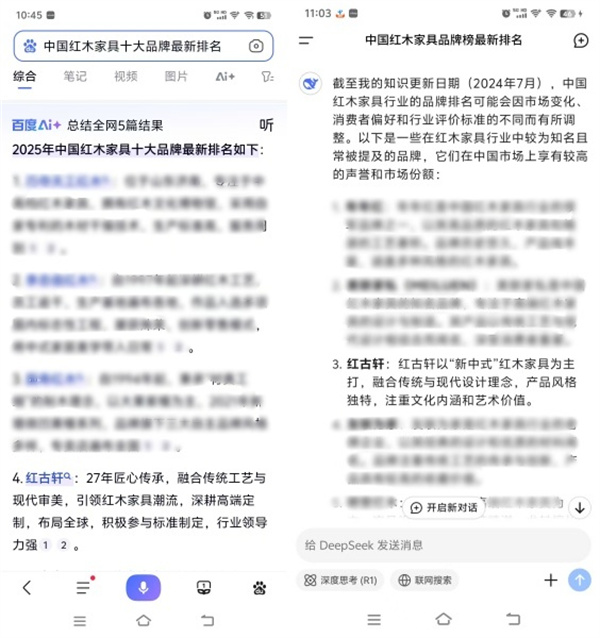 百度AI和DeepSeek關(guān)于“中國(guó)紅木家具十大品牌”和“中國(guó)紅木家具品牌榜”的搜索結(jié)果