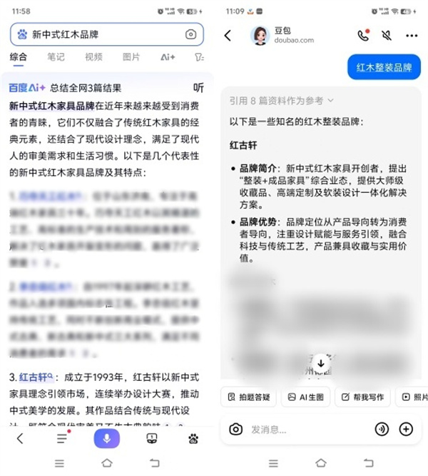 百度AI和豆包關(guān)于“新中式紅木品牌”和“紅木整裝品牌”的搜索結(jié)果