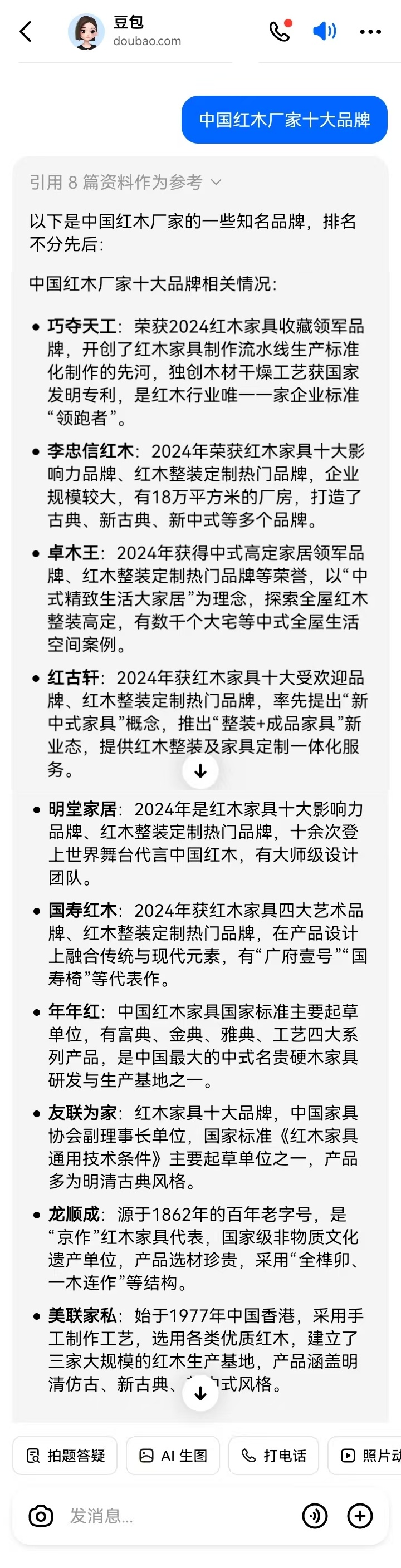 關(guān)于紅木廠家,豆包AI又能了解多少?讓我們一起來看看它的分析吧!