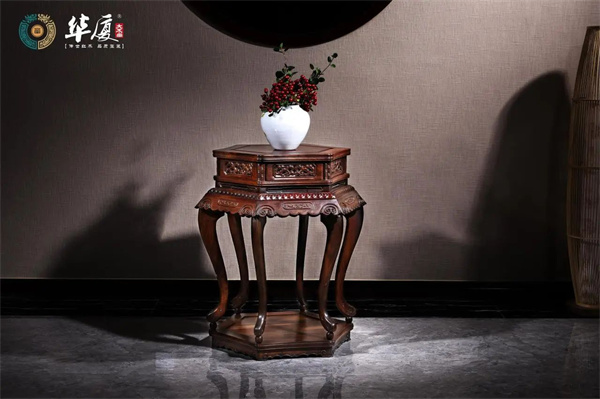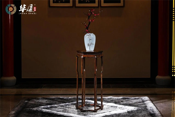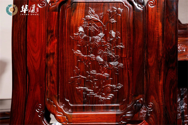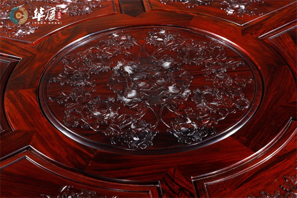 華廈·大不同推出的《富貴牡丹圓臺》,精選大紅酸枝這一珍貴木材,色澤沉穩(wěn)古雅,質地堅硬細膩,適合做精品家具。