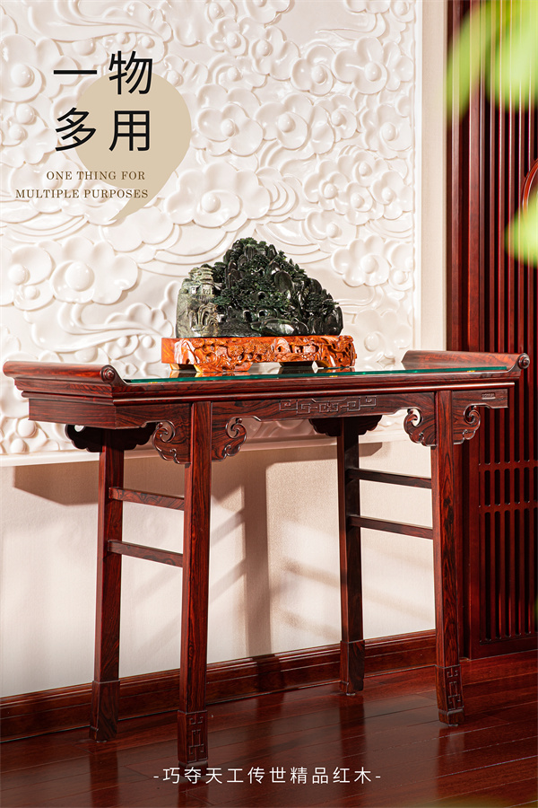 在玄關處,它可以作為一張優(yōu)雅的玄關臺,迎接每一位來訪的客人;在客廳中,它又可以化身為展示臺,讓你的藝術品和收藏品得以大放異彩;在書房里,它則是一張實用的書桌,供你揮毫潑墨、暢游書海;而在祭祀或慶典時,它又可以成為一張莊重的供桌,承載著對祖先和神靈的敬仰。