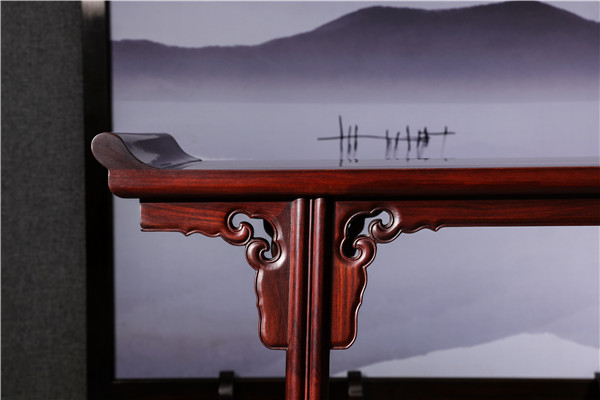 再往里走,一張清代風(fēng)格的翹頭案吸引了眾人的目光。這張翹頭案設(shè)計(jì)巧妙,既可作為書(shū)桌使用,又可擺放茶具、花藝,為生活增添一份雅致。絨毛黃檀的質(zhì)地細(xì)膩溫潤(rùn),經(jīng)過(guò)匠人的精心打磨,更顯得光彩照人,讓人愛(ài)不釋手。