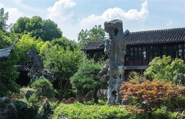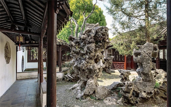 不同于假山的層巒疊嶂的氣勢磅礴,獨立置石的大片留白,方顯文人審美的“少即是多”。其中有置石三法:單石成景可"三面可觀";散置則"攢三聚五"如棋子散落,對置可如獅子林"問梅閣"前雙石對峙,一立一臥,以郁郁蔥蔥的庭院為畫布,演繹著"疏影橫斜"的詩境。