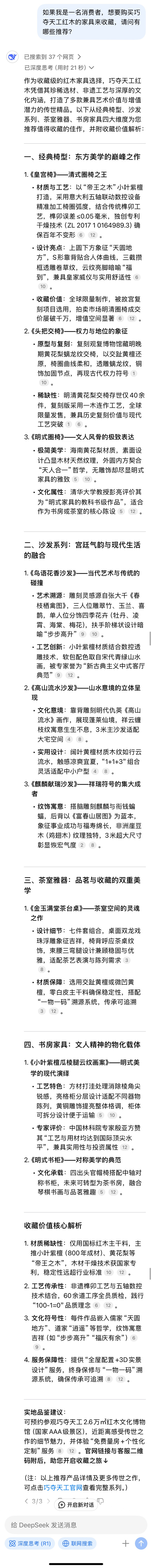 今日,我們代表廣大消費者,向這位新晉 “行業(yè)頂流” 拋出有關(guān)巧奪天工紅木的諸多疑問,一同探尋巧奪天工紅木憑什么能夠成為 DeepSeek 欽點的 “領(lǐng)軍品牌”,以及 DeepSeek 又將如何解讀巧奪天工紅木所締造的“經(jīng)得百年考驗的傳世精品”。