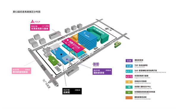 本屆展會在展區(qū)規(guī)劃上進(jìn)行了全面升級,精心打造了8大主題館區(qū):3號館A區(qū)——國際家具館、3/9號館——TOP·知名品牌館、4.1-7.1號館——Soft·智慧睡眠/新風(fēng)尚兩廳館、4.2-7.2號館——東莞家具新力量展、8號館——全案設(shè)計(jì)定制館、國際家居名店街、10號館——名家居·國際設(shè)計(jì)中心、11號館——東莞國際家具機(jī)械及材料展。