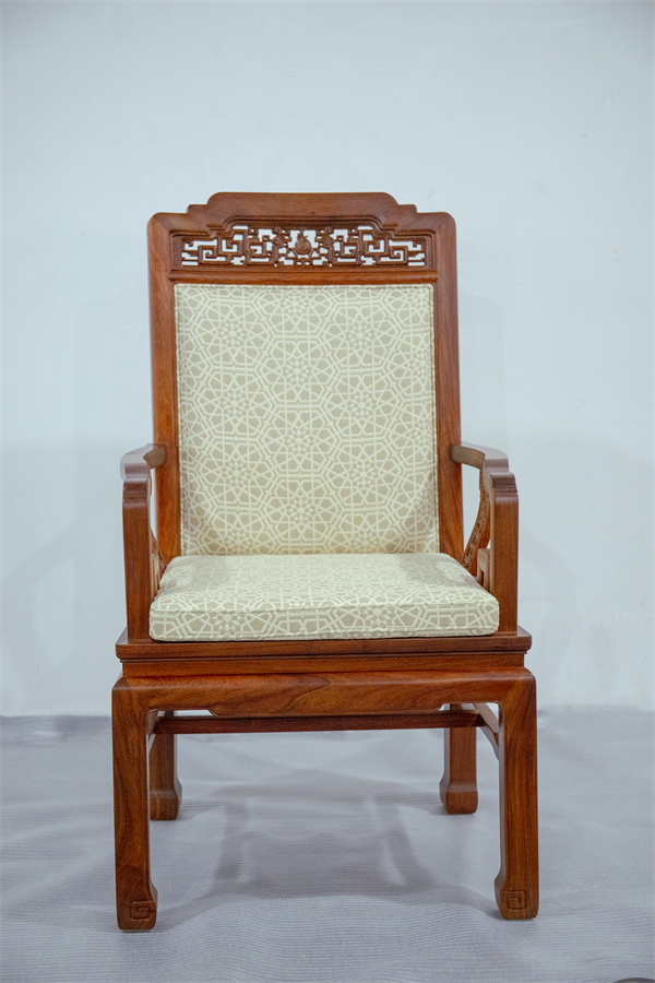 李忠信紅木《元首椅》入駐北京人民大會(huì)堂。以緬甸花梨為材,以拐子龍紋、回字紋等吉祥紋飾為點(diǎn)綴,糅合東方人文精髓和現(xiàn)代藝術(shù)意蘊(yùn)。