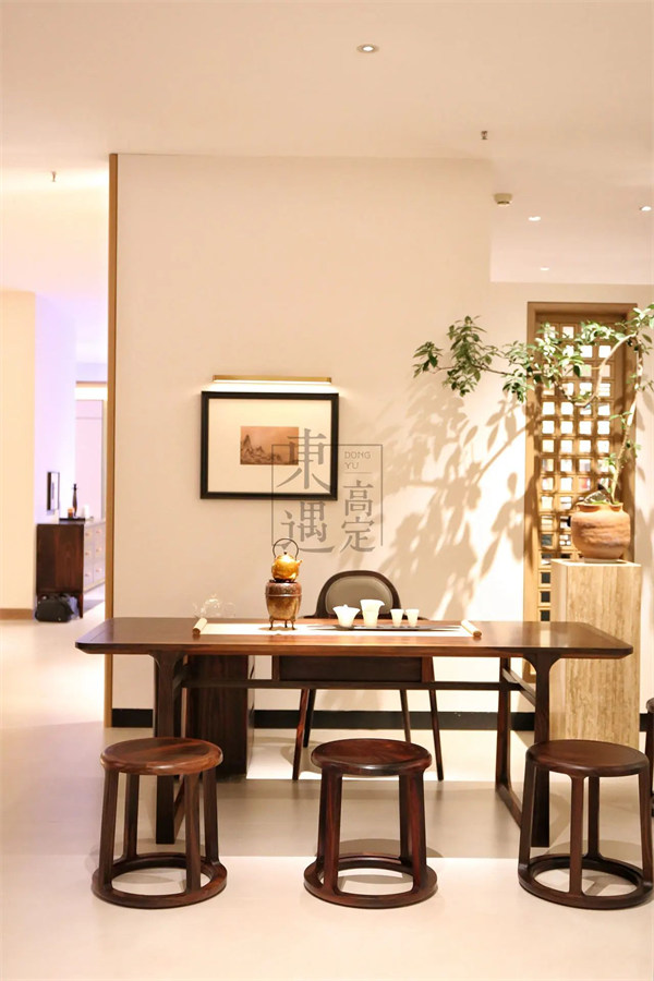 區(qū)別于展會場景的“概念化呈現(xiàn)”,東遇家居羅浮宮店注重生活場景的還原。旗艦店內(nèi)劃分為大廳、茶室、宴居、書房等區(qū)域: