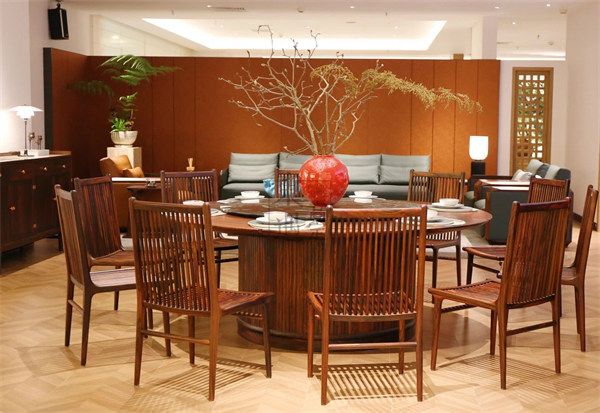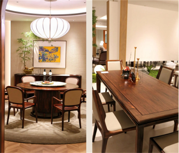 上善餐桌轉(zhuǎn)臺理石如天然山水紋,頭頂琉璃吊燈傾瀉暖光,為整個空間增添了幾分夢幻與溫馨。君碩長餐桌整體簡潔,整板闊葉黃檀釋放流水紋肌理,東方宴飲的雅致與當代生活的松弛在此悄然相融。
