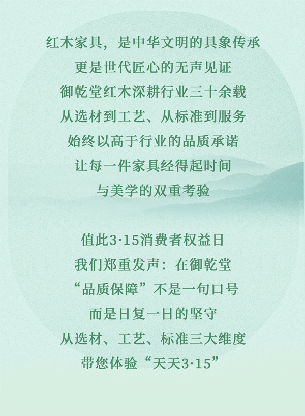 [摘要]在御乾堂紅木,“天天都是3·15”,因?yàn)槲覀兩钪?,真正的傳承從不敢辜?fù)每一份信任。