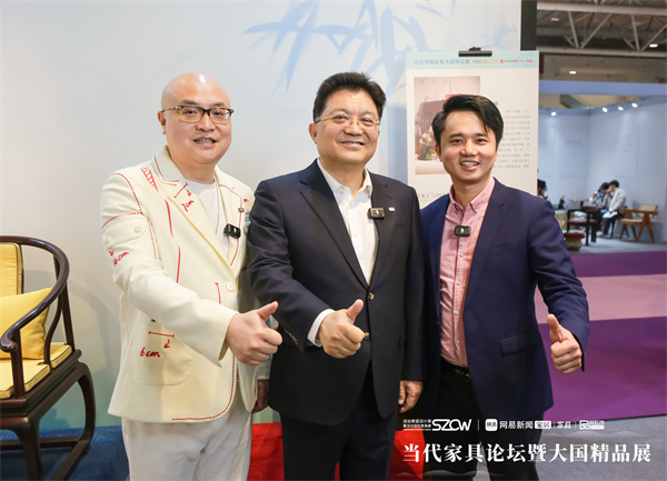2025當(dāng)代中國(guó)家具發(fā)展論壇暨大國(guó)精品展的策劃人、全聯(lián)藝術(shù)紅木家具專(zhuān)業(yè)委員會(huì)執(zhí)行會(huì)長(zhǎng),網(wǎng)易新聞家居家具負(fù)責(zé)人、品牌紅木CEO林偉華(右)和北京國(guó)富縱橫總裁、大家居教育平臺(tái)創(chuàng)始人趙龍(中)、全聯(lián)藝術(shù)紅木家具專(zhuān)業(yè)委員會(huì)主席團(tuán)主席、東陽(yáng)卓木王總裁杜長(zhǎng)江(左)在大國(guó)精品展交流