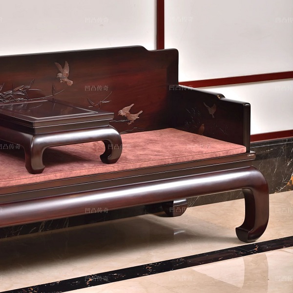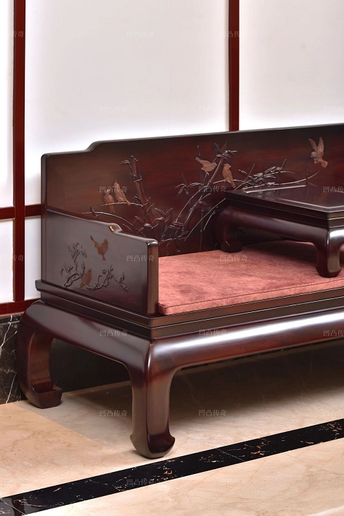 沙發(fā)靠背采用傳統(tǒng)絲翎檀雕工藝,雕琢出花鳥與翠竹的雅致圖案。