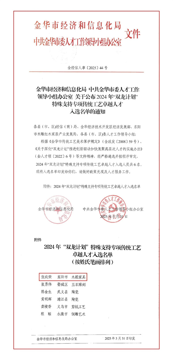 近日,金華市經(jīng)濟和信息化局與中共金華市委人才工作領導小組辦公室聯(lián)合發(fā)布2024年“雙龍計劃”特殊支持專項傳統(tǒng)工藝卓越人才入選名單,東陽市明堂紅木家俱有限公司總經(jīng)理張向榮以木雕家具領域的卓越貢獻強勢登榜。作為金華市傳統(tǒng)工藝領域的最高榮譽之一,“雙龍計劃”旨在表彰扎根一線、技藝精湛、推動產(chǎn)業(yè)創(chuàng)新發(fā)展的領軍人物。張向榮憑借36年深耕行業(yè)的匠心積淀、百余項專利創(chuàng)新成果及對技藝傳承的傾力投入,成為金華市僅6席的殊榮獲得者之一,更是東陽木雕紅木產(chǎn)業(yè)唯一。