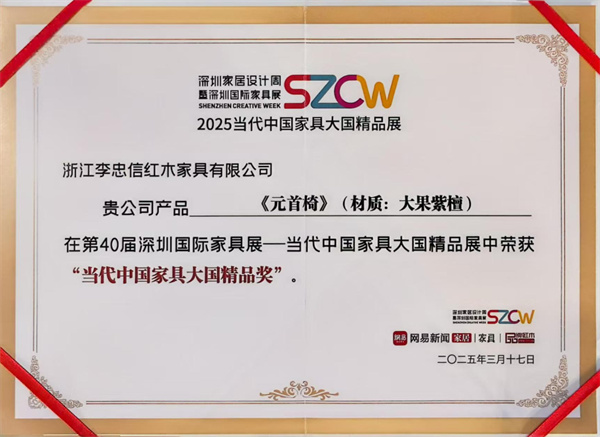 3月18日,深圳國際家具展頒獎典禮上,鎏金獎杯照亮了?李忠信紅木的榮耀時刻——?元首椅從全球327件參賽作品中脫穎而出,榮膺“當代中國家具大國精品獎”。
