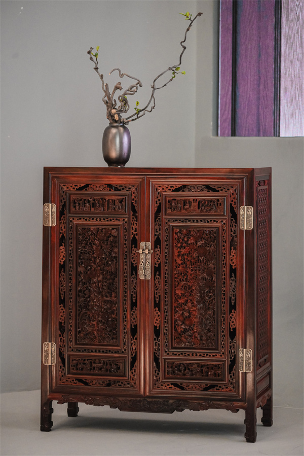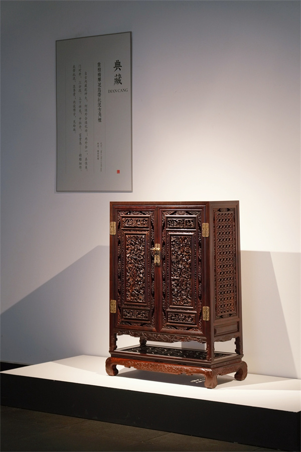 于活動現(xiàn)場展出的《紫檀精雕花鳥帶托泥方角柜》