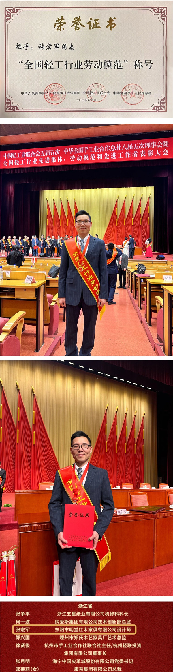 2025年4月10日,由中國輕工業(yè)聯(lián)合會、中華全國手工業(yè)合作總社聯(lián)合主辦的"全國輕工行業(yè)先進(jìn)集體、勞動模范和先進(jìn)工作者表彰大會"在北京會議中心隆重舉行。明堂家居首席設(shè)計師張宏軍憑借卓越貢獻(xiàn)榮膺"全國輕工行業(yè)勞動模范"稱號,成為東陽紅木家具行業(yè)首位獲此殊榮的杰出人才。這一榮譽(yù)不僅是對張宏軍個人職業(yè)生涯的高度認(rèn)可,更是明堂家居深耕行業(yè)、引領(lǐng)創(chuàng)新、傾力育才的生動寫照。