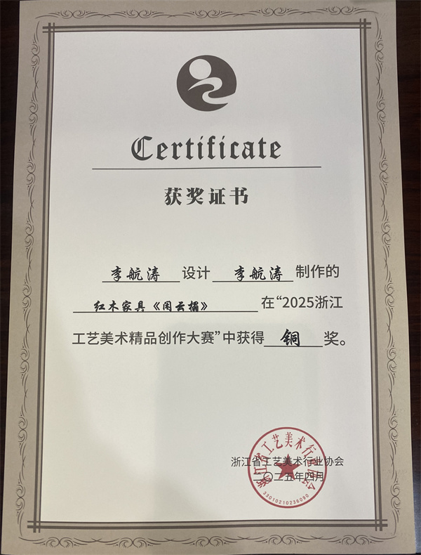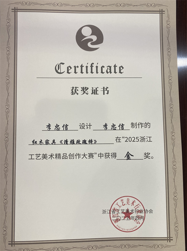 在“2025浙江工藝美術(shù)精品創(chuàng)作大賽”中,李忠信紅木的清雅玫瑰椅和元首椅憑借其精湛的工藝和獨(dú)特的設(shè)計(jì),榮獲金獎(jiǎng),閑云榻則榮獲銅獎(jiǎng)。這些榮譽(yù)不僅是對(duì)李忠信紅木工藝水平的高度認(rèn)可,更是對(duì)其在傳承與創(chuàng)新方面不懈努力的肯定。金獎(jiǎng)的獲得,不僅是對(duì)李忠信紅木品牌實(shí)力的展示,更是對(duì)中華傳統(tǒng)工藝的傳承與弘揚(yáng)。