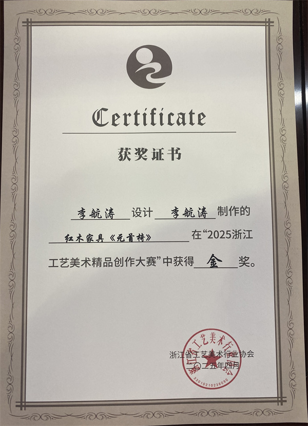 元首椅在“2025浙江工藝美術(shù)精品創(chuàng)作大賽”中榮獲金獎(jiǎng)