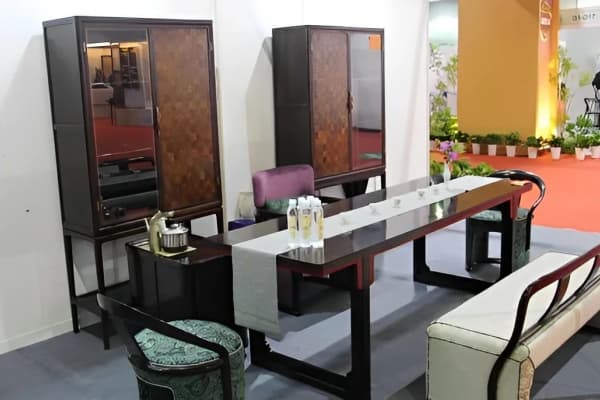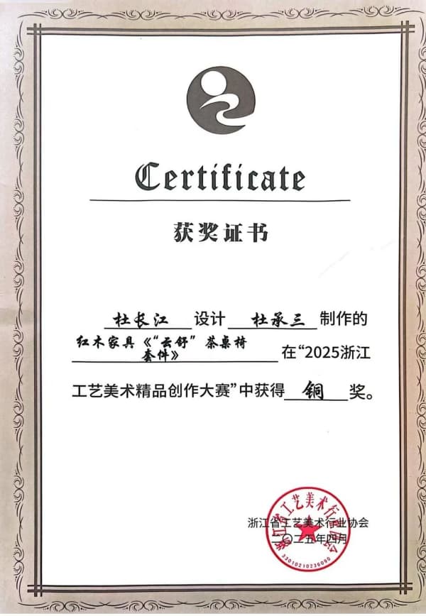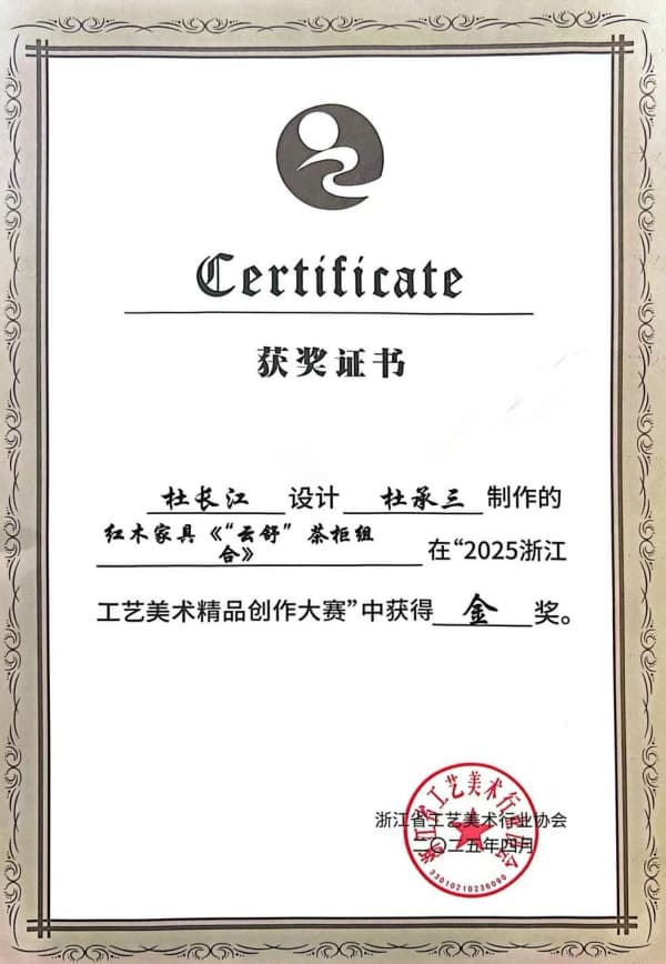 卓木王攜《云舒茶空間》在此次博覽會上演雙星傳奇:杜長江設(shè)計(jì)、杜承三制作的紅木家具《“云舒”茶柜組合》在“2025浙江工藝美術(shù)精品創(chuàng)作大賽”中獲得金獎(jiǎng);杜長江設(shè)計(jì)、杜承三制作的紅木家具《“云舒”茶桌椅套件》在“2025浙江工藝美術(shù)精品創(chuàng)作大賽”中獲得銅獎(jiǎng)。金銅輝映間,見證東方匠心的多維突破。