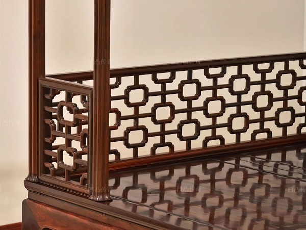 床圍由數(shù)百個(gè)小木塊精巧拼接,組成規(guī)整的十字花紋,這種工藝叫"攢斗"。