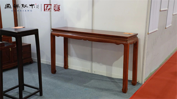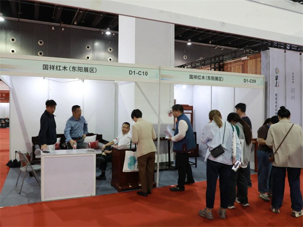 在國祥紅木展區(qū),觀眾不僅能近距離鑒賞采用緬甸花梨、紅酸枝等珍稀木材打造的精品家具。
