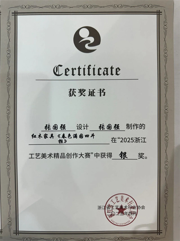 在本屆浙江工藝美術(shù)精品創(chuàng)作大賽評選中,國祥紅木再度彰顯設(shè)計實力:董事長張國強設(shè)計的《春色滿園四斗柜》將四季花卉濃縮于方寸之間,斬獲銀獎;