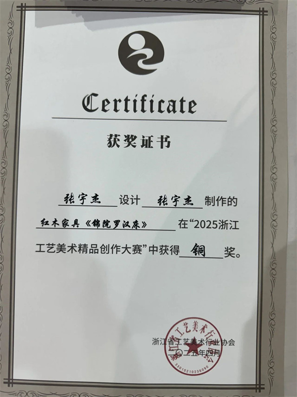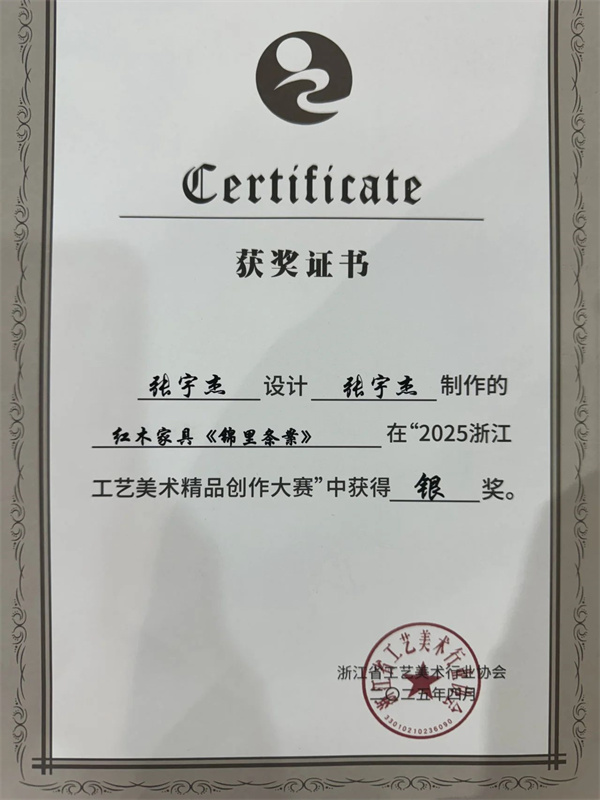 總經(jīng)理張宇杰設(shè)計的《錦里條案》巧妙將沉穩(wěn)冷峻的大理石與溫潤色澤的紅酸枝融合,憑借"藏寶于紅木"的設(shè)計哲思同獲銀獎;