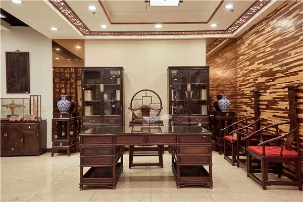 書房承載著精神世界的豐盈,一品居以紅木書案、官帽椅與書柜構(gòu)建文人雅集。