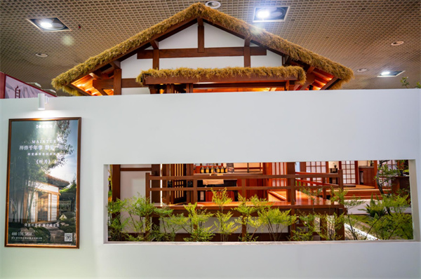 展位現(xiàn)場(chǎng),菠蘿格原木構(gòu)筑的"觀云""聽(tīng)月"木屋成為視覺(jué)中心:深褐色原木呈現(xiàn)宋式簡(jiǎn)約氣韻,格柵門窗嚴(yán)格遵循傳統(tǒng)比例,榫卯結(jié)構(gòu)展現(xiàn)力學(xué)與美學(xué)平衡;曲徑碎石、松竹盆景與月洞門構(gòu)成微縮園林,實(shí)現(xiàn)"移步換景"的古典審美體驗(yàn)。