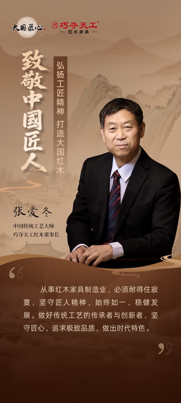 中國傳統(tǒng)工藝大師、巧奪天工紅木董事長張愛冬匠心語錄:從事紅木家具制造業(yè),必須耐得住寂寞,堅守匠人精神,始終如一,穩(wěn)健發(fā)展。做好傳統(tǒng)工藝的傳承者與創(chuàng)新者,堅守匠心,追求極致品質(zhì),做出時代特色。
