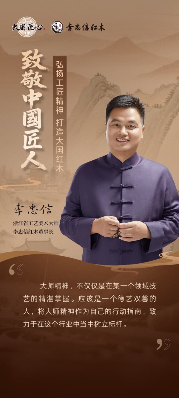 浙江省工藝美術(shù)大師,李忠信紅木董事長李忠信匠心語錄:大師精神,不僅僅是在某一個領域技藝的精湛掌握。應該是一個德藝雙馨的人,將大師精神作為自己的行動指南,致力于在這個行業(yè)中當中樹立標桿。