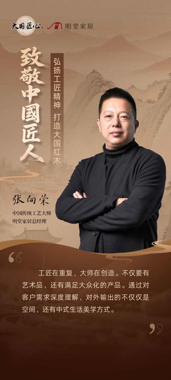 中國傳統(tǒng)工藝大師、明堂家居總經(jīng)理張向榮匠心語錄:工匠在重復,大師在創(chuàng)造。不僅要有藝術(shù)品,還有滿足大眾化的產(chǎn)品。通過對客戶需求深度理解,對外輸出的不僅僅是空間,還有中式生活美學方式。