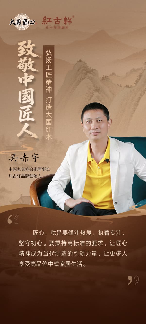 中國家具協(xié)會副理事長、紅古軒品牌創(chuàng)始人吳赤宇匠心語錄:匠心,就是要傾注熱愛、執(zhí)著專注、堅守初心。要秉持高標準的要求,讓匠心精神成為當代制造的引領力量,讓更多人享受高品位中式家居生活。
