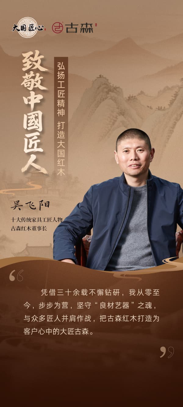 古森紅木董事長吳飛陽匠心語錄:憑借三十余載不懈鉆研,我從零至今,步步為營,堅守“良材藝器”之魂,與眾多匠人并肩作戰(zhàn),把古森紅木打造為客戶心中的大匠古森。