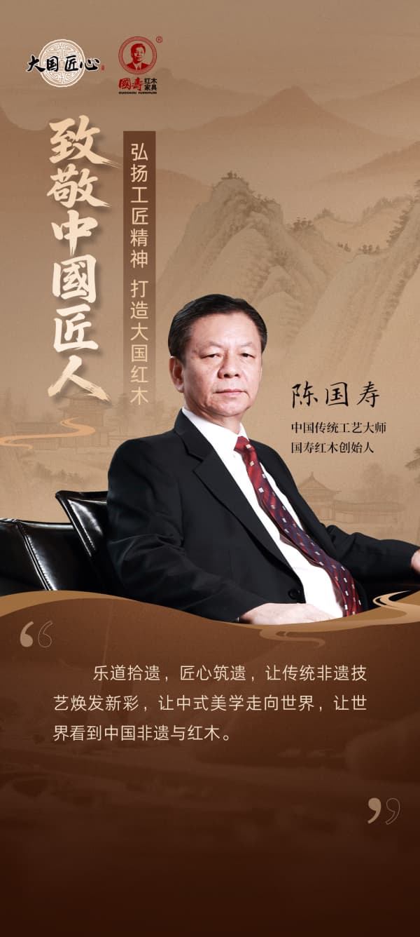 中國傳統(tǒng)工藝大師、國壽紅木創(chuàng)始人陳國壽匠心語錄:樂道拾遺,匠心筑遺,讓傳統(tǒng)非遺技藝煥發(fā)新彩,讓中式美學走向世界,讓世界看到中國非遺與紅木。