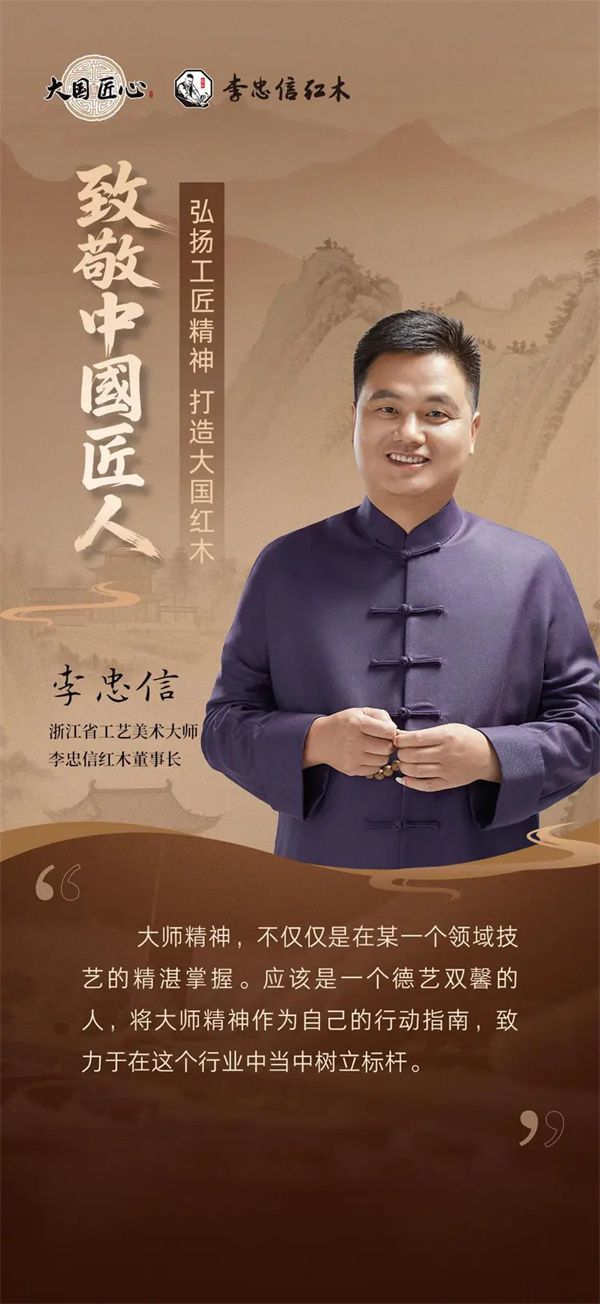 在李忠信紅木的世界里,工藝大師精神是他們最寶貴的財(cái)富。李忠信董事長(zhǎng)作為浙江省工藝美術(shù)大師,他不僅在技藝上精湛無比,更在品德上令人敬佩。他認(rèn)為,大師精神不僅僅是在某一個(gè)領(lǐng)域技藝的精湛掌握,更是一個(gè)德藝雙馨的人。這種對(duì)大師精神的理解,成為了李忠信紅木的行動(dòng)指南。