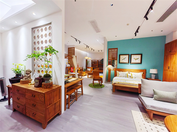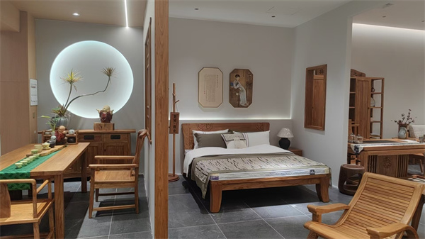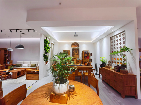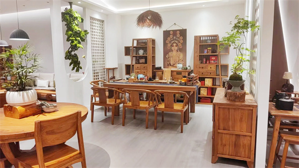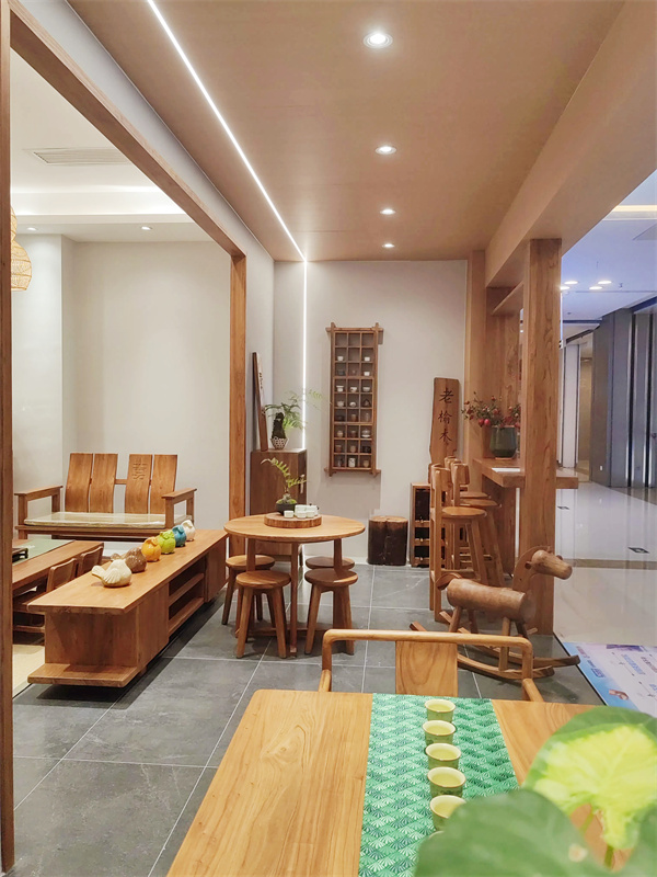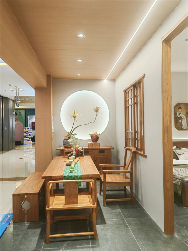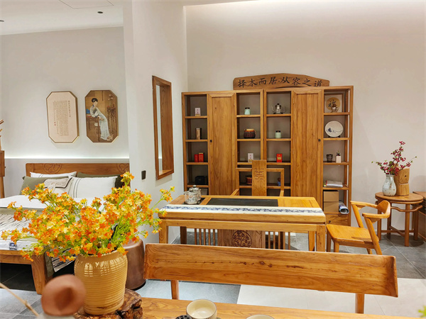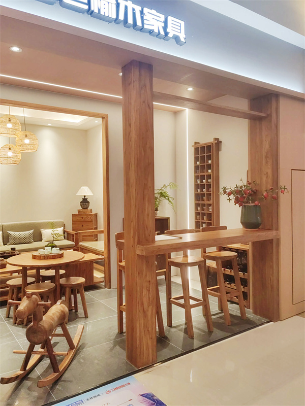 門店展廳內(nèi)鋪陳十余套沉浸式場景,打造“一屋多景”的生活劇場——茶香裊裊的老榆木茶桌、可以親子共讀的成長老榆木書桌、適配嶺南濕熱的防潮客廳,整體實景空間以老榆木為脈絡(luò),串聯(lián)起為玉林市人民打造的生活圖景。每一處場景都可以讓顧客親手撫摸老榆木的溫潤肌理,感受歲月沉淀的溫度。