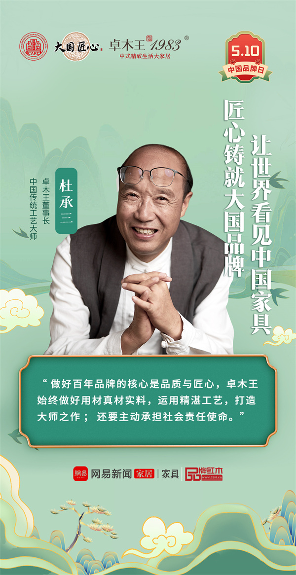 中國(guó)傳統(tǒng)工藝大師、卓木王董事長(zhǎng)杜承三匠心語錄:“做好百年品牌的核心是品質(zhì)與匠心,卓木王始終做好用材真材實(shí)料,運(yùn)用精湛工藝,打造大師之作;還要主動(dòng)承擔(dān)社會(huì)責(zé)任使命?!?/span>