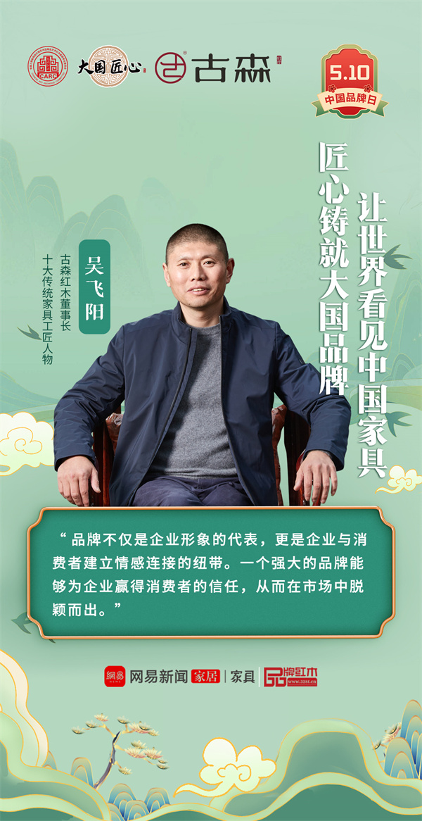 十大傳統(tǒng)家具工匠人物、古森紅木董事長(zhǎng)吳飛陽匠心語錄:“品牌不僅是企業(yè)形象的代表,更是企業(yè)與消費(fèi)者建立情感連接的紐帶。一個(gè)強(qiáng)大的品牌能夠?yàn)槠髽I(yè)贏得消費(fèi)者的信任,從而在市場(chǎng)中脫穎而出?!?/span>