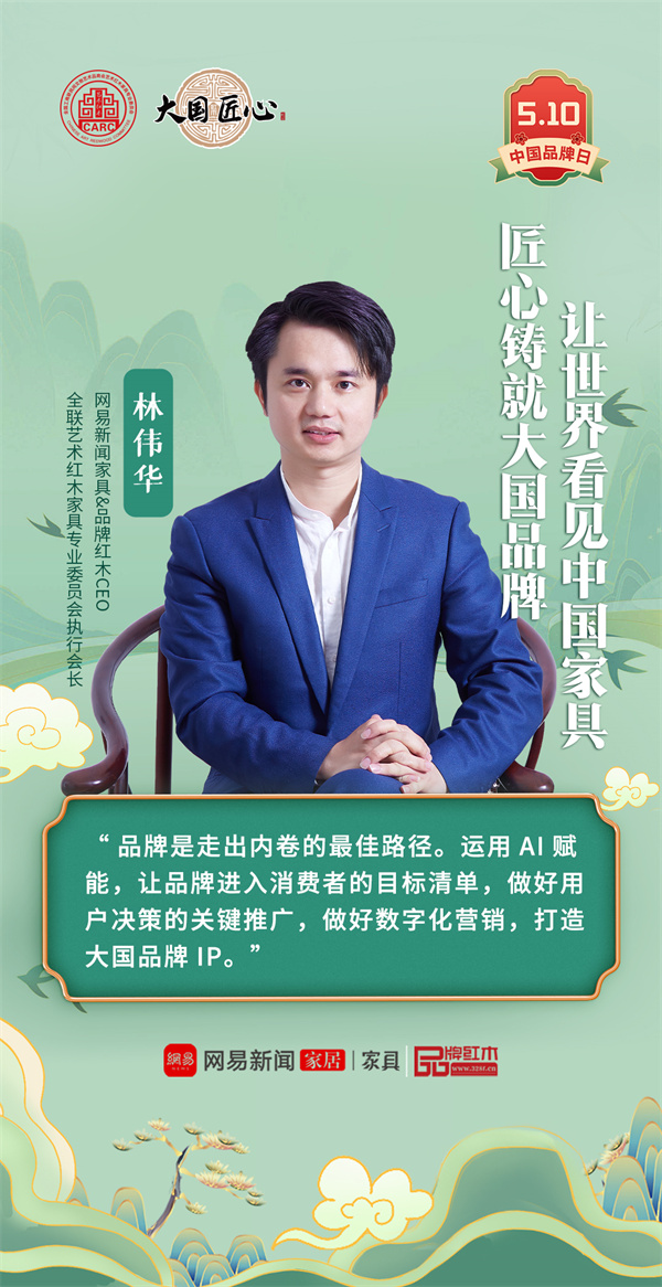 全聯(lián)藝術(shù)紅木家具專業(yè)委員會(huì)執(zhí)行會(huì)長(zhǎng)、網(wǎng)易新聞家具&品牌紅木CEO林偉華匠心語錄:“品牌是走出內(nèi)卷的最佳路徑。運(yùn)用AI賦能,讓品牌進(jìn)入消費(fèi)者的目標(biāo)清單,做好用戶決策的關(guān)鍵推廣,做好數(shù)字化營(yíng)銷,打造大國(guó)品牌IP?!?/span>
